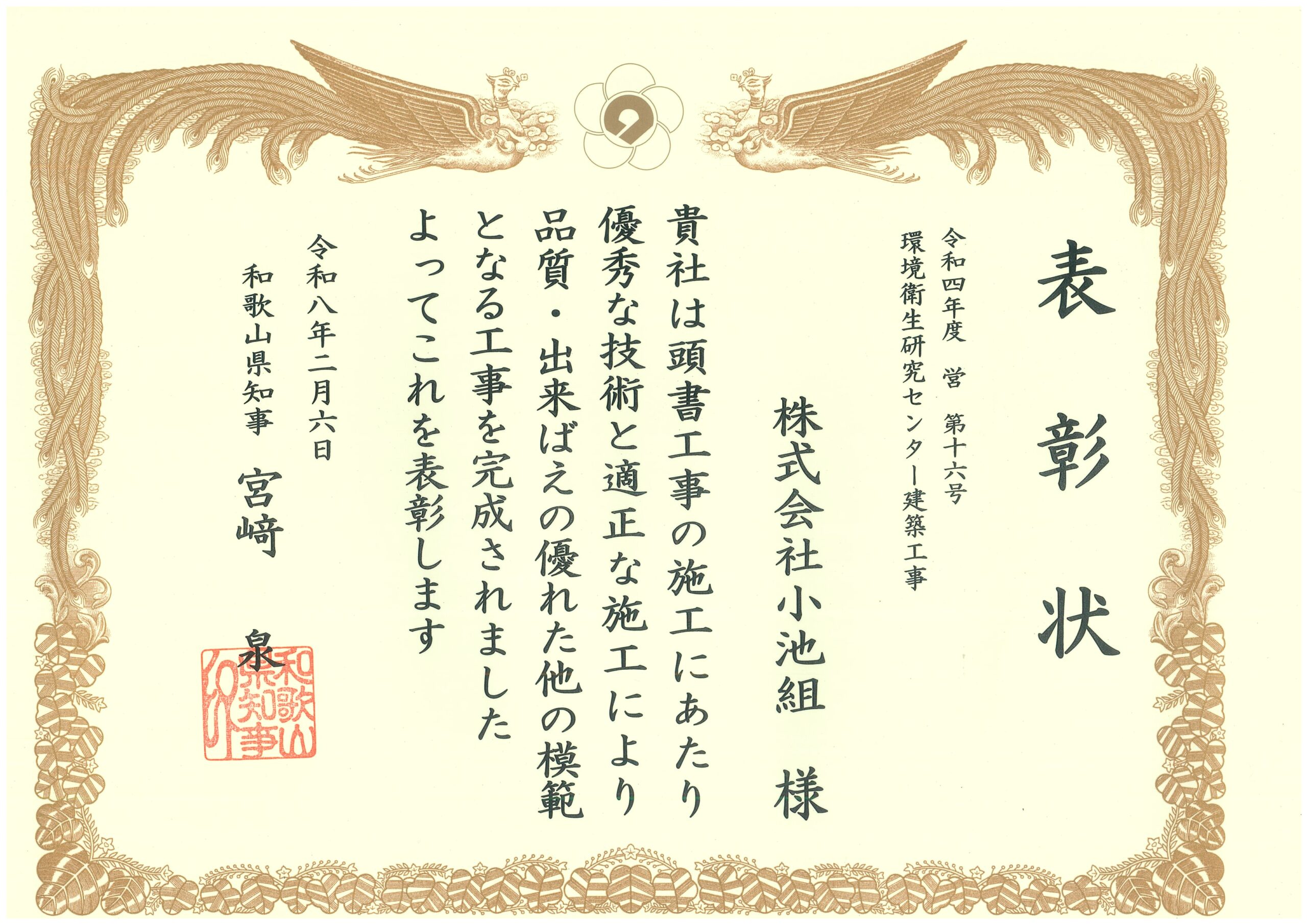和歌山県より「令和6年度完成工事 和歌山県優良工事表彰」を受賞いたしました